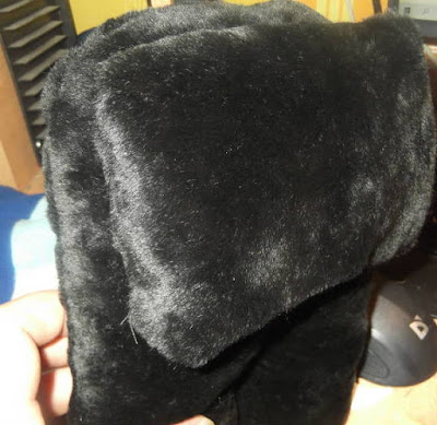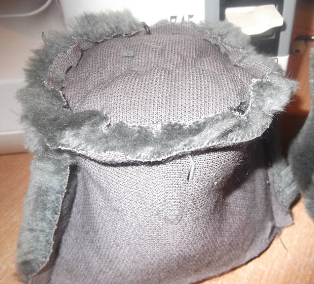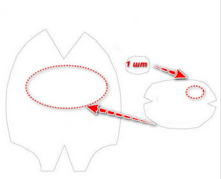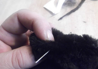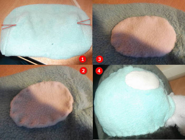 К лицевой части игрушки приметываем и пришиваем визор, но не увлекаемся и не зашиваем до конца оставляя небольшое отверстие, через которое набиваем визор синтепоном для придания обьемности.