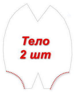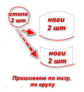 5. Пришиваем к низу Тела сшитые Ноги. По выкройке одна часть у ног выше и пришиваем её там, где выемка для ног больше.