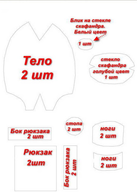 Если вы будете шить на машинке каждую деталь игрушки, то рюкзак и скафандр с «бликом», нужно притачать до того, как будете набивать игрушку наполнителем. То есть: