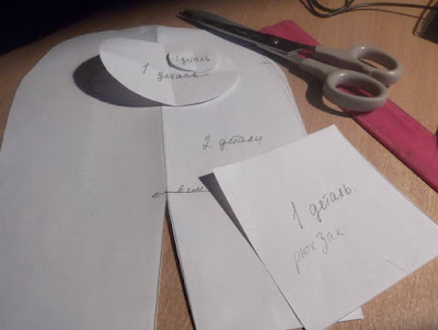 Далее выкройку рюкзачка сгибаем пополам и выкраиваем две детали рюкзачка. Сшиваем их, набиваем синтепоном и приклеиваем к телу.