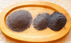 • В большую чугунную сковороду высыпают пачку соли и стакан с четвертью ржаной муки и, непрерывно размешивая состав деревянной лопаткой по часовой стрелке, доводят смесь до получения насыщенного черного цвета, после чего остужают и перетирают в ступке.