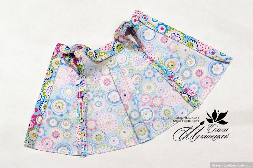 Припуски обметываем строчкой зигзаг. Складки отворачиваем вниз. Юбку подгибаем с напуском 1 см и пришиваем декоративным швом нитками мулине.