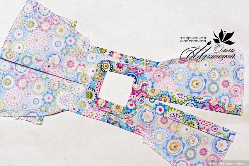 10. Надсеките припуски во внутренних углах горловины, выверните обтачку наизнанку и отутюжьте. Если все сделано правильно, края обтачки окажутся спрятанными под планками.