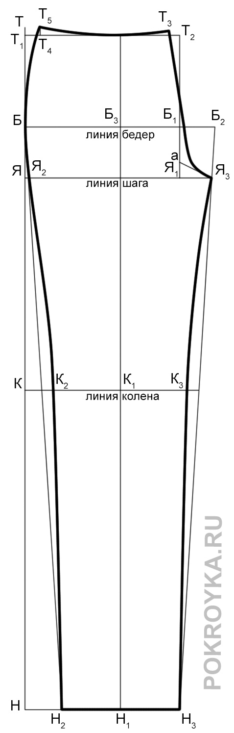 Измерить отрезок К3Я3 на передней части брюк и отложить найденное значение за вычетом величины растяжения материала равной 0-0,5 см от К5 вверх, получаем Я4.